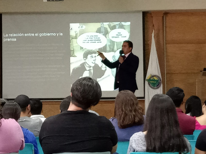 Chihuahua, Chih.-Esta tarde el ex presidente del Foro de Periodista de Chihuahua, Ernesto Almanza Aguilar presentó la conferencia denominada Propaganda y Medios; La Herramienta del Poder ante estudiantes de la Facultad de Ciencias...