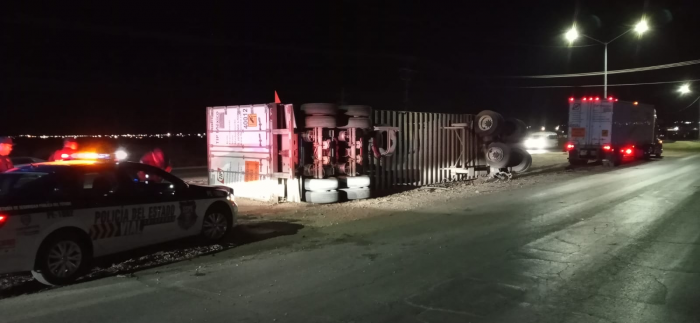 Chihuahua, Chih.- Esta noche se presentó una impresionante volcadura de un tráiler en la salida Chihuahua a Delicias sobre el Fuentes Mares, lo cual generó un bloqueo vehicular.