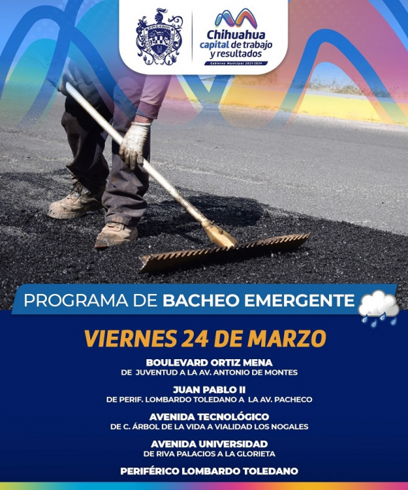 Chihuahua, Chih.- El Gobierno Municipal que encabeza el alcalde Marco Bonilla, continúa trabajando con el plan emergente de bacheo en calles y avenidas principales de la ciudad, debido a los daños ocasionados...