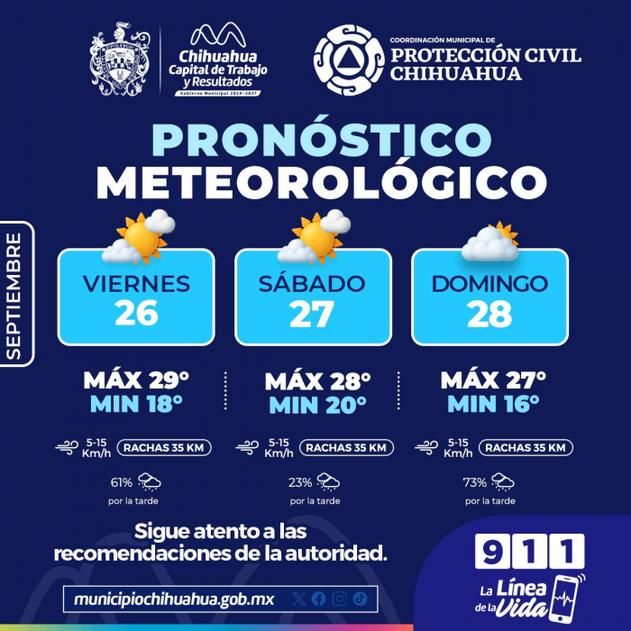 Chihuahua, Chih.- El Gobierno Municipal de Chihuahua, a través de la Coordinación Municipal de Protección Civil, informa las condiciones meteorológicas previstas para este fin de semana, con base en el...