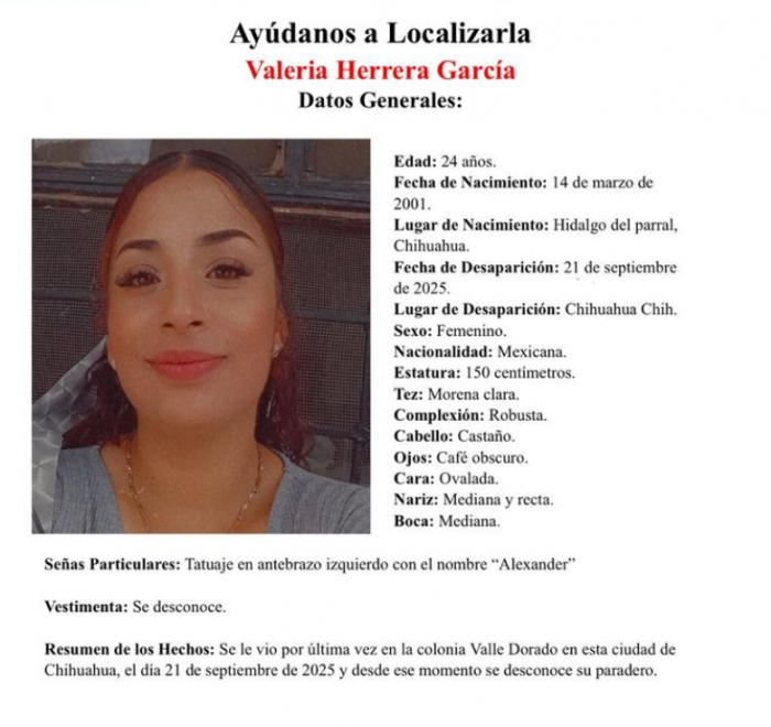 Chihuahua, Chih.- La Fiscalía emitió una pesquisa para localizar a Valeria Herrera García, de 24 años, quien fue vista por última vez en la colonia Valle Dorado de la ciudad de Chihuahua.
