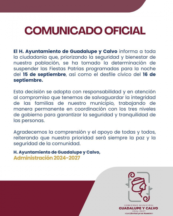 Chihuahua, Chih.- Con el objetivo de proteger a la población, el Ayuntamiento de Guadalupe y Calvo confirmó la cancelación de los festejos del Grito de Independencia y del desfile cívico del 16 de septiembre.