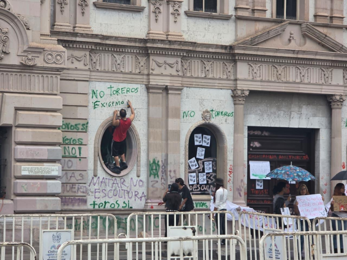 Chihuahua, Chih.- Elementos de la Policía Municipal detuvieron esta tarde a dos hombres manifestantes de un grupo promotor de los derechos de los animales, por actos de vandalismo al realizar pintas en edificios públicos,...
