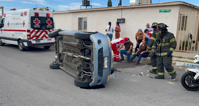 Chihuahua.- Un aparatoso accidente se registró este martes , luego de que un vehículo compacto terminara volcado sobre la calle Ramón Córdova y Ramón Cordova