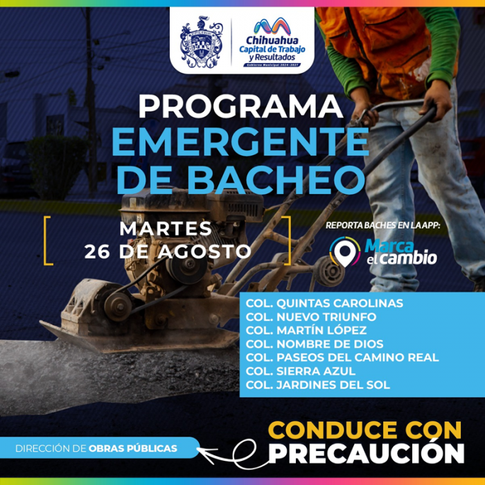 Chihuahua, Chih.- El Gobierno Municipal, a través de la Dirección de Obras Públicas, intervendrá con bacheo este 26 de agosto, mediante el...