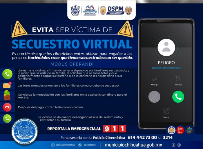 Chihuahua, Chih.- Agentes de Inteligencia de la Dirección de Seguridad Pública Municipal evitaron un intento de extorsión cibernética mediante engaños con un caso de secuestro virtual, y...