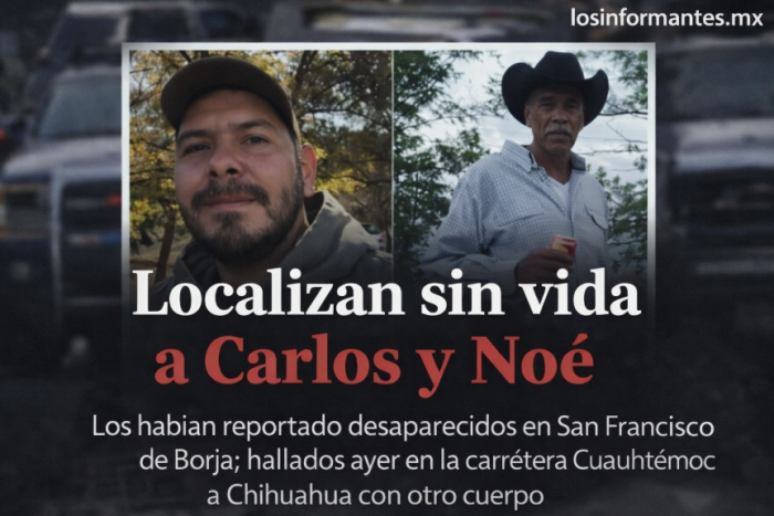 Chihuahua, Chih.- Carlos M. L., de 44 años, y Noé L. M., de 57, fueron reconocidos por sus familiares luego de ser localizados sin vida en la carretera a Chihuahua, a la altura de Barraganes, en el municipio de...