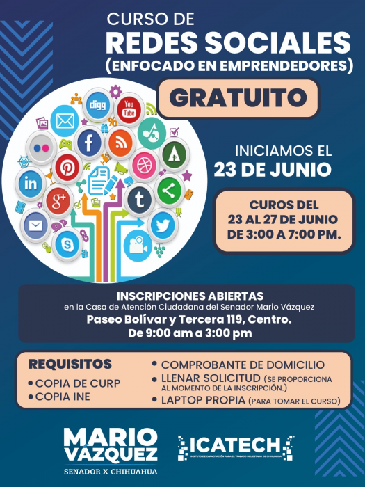 Chihuahua, Chih. – Continúan abiertas las inscripciones para el curso gratuito “Manejo de Redes Sociales para Emprendedores”, que se llevará a cabo del 23 al 27 de junio en la Casa de Atención...