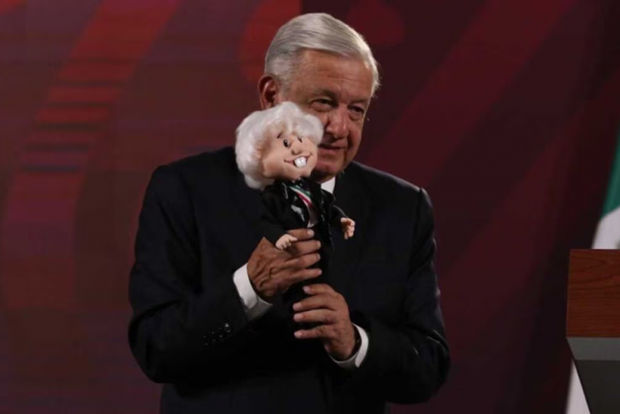 El presidente López Obrador presionó entre risas el botón del muñeco para que hablara