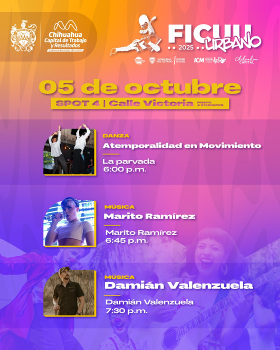 Chihauhua, Chih.- Este sábado 4 de octubre inicia el Festival Internacional de la Ciudad de Chihuahua (FICUU) 2025, con actividades gratuitas para toda la familia. El FICUU Urbano abrirá el telón con presentaciones de...
