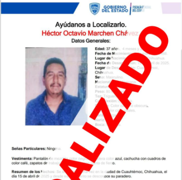 CHIHUAHUA, Chih.- La Fiscalía de Distrito Zona Occidente, dio por concluida la carpeta de investigación iniciada con motivo del reporte de desaparición de Héctor Octavio M. C., de 37 años de edad, quien se hallaba...