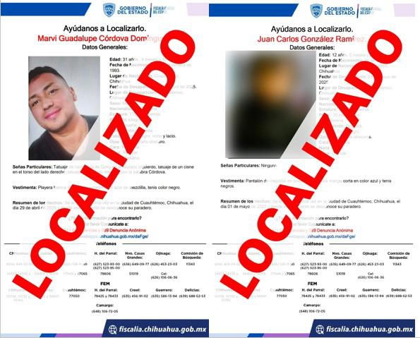 CUAUHTEMOC, Chih.- La Fiscalía de Distrito Zona Occidente concluyó las carpetas de investigación, iniciadas con motivo de los reportes de ausencia de un adulto y un menor de edad, tras localizarlos sanos y...