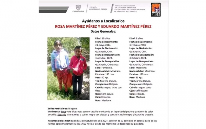 CHIHUAHUA, Chih., 22 de febrero de 2025.-Luego de cuatro meses de ausencia, fueron localizados con vida los hermanitos desaparecidos en Guachochi Chihuahua, según informaron fuentes de la Fiscalía General del Estado.