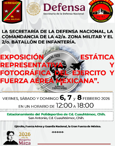 Chihuahua, Chih.- La Secretaría de la Defensa Nacional anunció la realización de una exposición estática, representativa y fotográfica del Ejército y Fuerza Aérea Mexicanos en la ciudad...