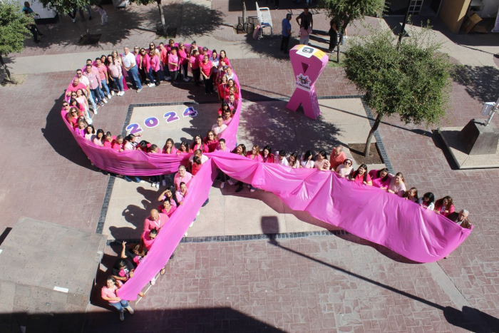 Chihuahua, Chih.- Con el fin de concientizar y sensibilizar a la población derechohabiente sobre la lucha contra el cáncer de mama, personal de Pensiones Civiles del Estado (PCE) se unió para crear un lazo humano rosa...