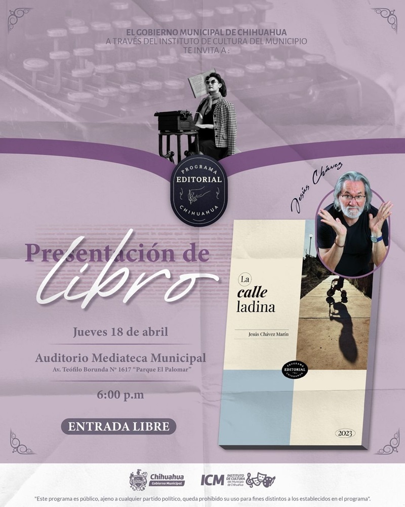 Como la presentación de libro "La calle ladina" de Jesús Chávez Marín, seleccionado del Programa Editorial Chihuahua 2024, que será este este jueves 18 de abril a las 6:00 de la tarde, en el Auditorio de la Mediateca Municipal, ubicada en avenida Teófilo Borunda #1617, en las inmediaciones del parque El Palomar.