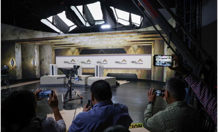 En el set, ubicado en el edificio uno de Estudios Churubusco, personal del INE detalló que esta vez los candidatos estarán de pie frente a tres atriles colocados delante de los dos moderadores.