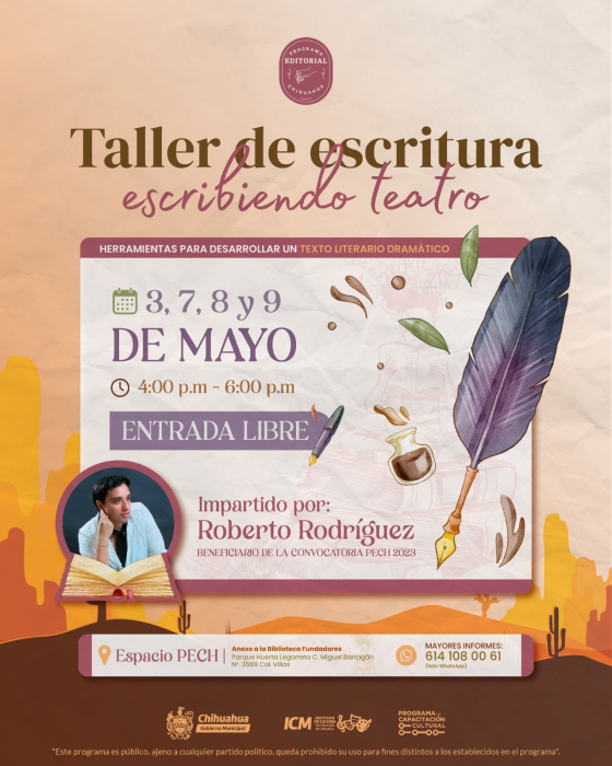 Este taller, es parte del Programa Editorial Chihuahua (PECH) y será impartido por el Roberto Rodríguez, uno de los seleccionados del PECH 2023 y autor del libro "Extrospección: Tres obras de teatro en una voz", promete ser una experiencia enriquecedora para todos los amantes del teatro y la escritura.