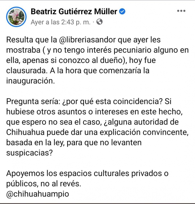 Chihuahua, Chih.- Beatriz Gutiérrez Müller, esposa del presidente de la República, Andrés Manuel López Obrador cuestionó a través de las redes sociales la clausura de la librería Sandor Marai, justo el día de la inauguración de dicho negocio y sobre todo cuando se presentaría el libro Rebeldes de su propiedad.En su cuenta personal de Facebook, la esposa del Presidente pidió a las autoridades de Chihuahua que den una explicación del porque se llevó a cabo la clausura.