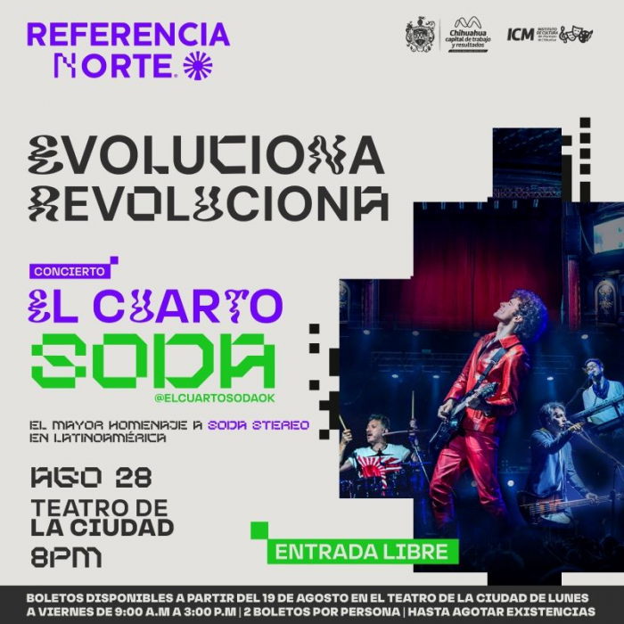 Chihuahua, Chih.- El Instituto de Cultura del Municipio invita a todos los interesados a asistir al concierto de El Cuarto Soda, homenaje a Soda Stereo, a recoger hasta dos boletos gratuitos por persona a partir de hoy, lunes 19 de agosto en la taquilla del Teatro de la Ciudad, de lunes a viernes en un horario de 9:00 am a 3:00 pm.