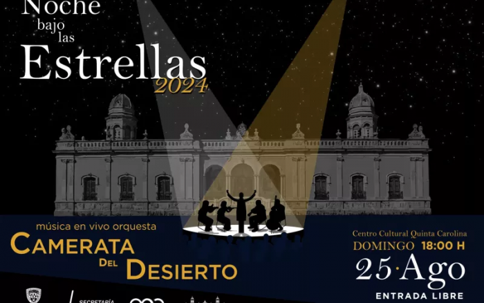 Chihuahua, Chih.- La Secretaría de Cultura invita al concierto “Noche Bajo las Estrellas”, a cargo de la orquesta Camerata del Desierto y con la participación de la solista Claudia Rico, este domingo 25 de agosto a las 18:00 horas en el Centro Cultural Quinta Carolina, con entrada libre.