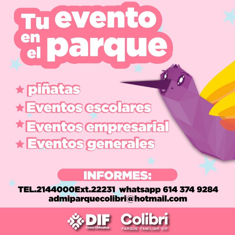 Chihuahua, Chih.- El DIF Estatal, a través de la Dirección de Esparcimiento, invita a las familias de Chihuahua a rentar el parque “El Colibrí” para sus eventos.
