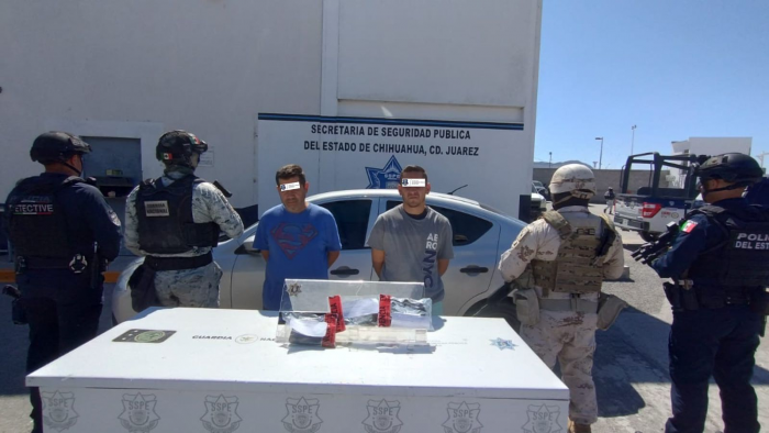 Chihuahua, Chih.- Elementos del Grupo Especial de Detectives de la Secretaría de Seguridad Pública Estatal (SSPE), en coordinación con personal de Despliegue y Guardia Nacional, llevaron a cabo la detención de dos sujetos por violación a la Ley Federal de Armas de Fuego y Explosivos, además de delitos contra la salud y la presunta comisión de daños de las cámaras Centinela.Los hechos ocurrieron el 12 de septiembre en la colonia Fronteriza en Ciudad Juárez, cuando los elementos policiales detectaron un vehículo Nissan versa en circulación, el cual presuntamente fue utilizado en los daños causados a las cámaras Centinela, razón por la que se le dio alcance.