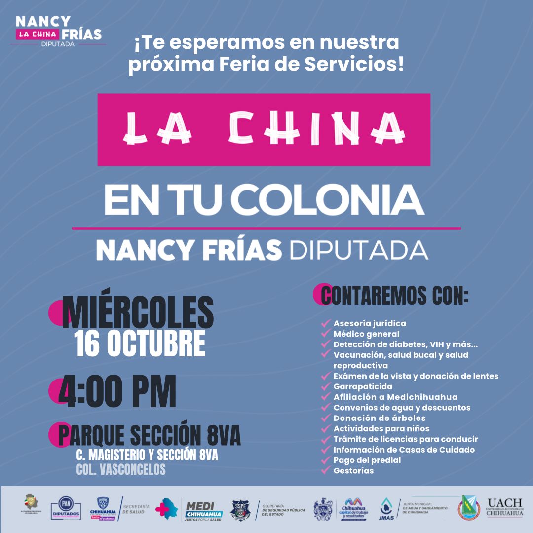 Por FELAChihuahua, Chih.- La diputada por el Partido Acción Nacional (PAN), Nancy "La China" Frías, anunció que el próximo miércoles 16 de octubre se llevará a cabo la feria de servicios comunitarios “La China en tu Colonia” en el Parque de la Sección 8, ubicado en la intersección de las calles Magisterio y Sección 8va, a partir de las 4:00 p.m.