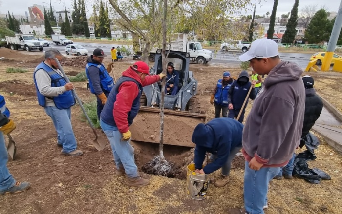 Chihuahua, Chih.- Con el propósito de continuar embelleciendo los espacios públicos de la ciudad, el Gobierno Municipal de Chihuahua, a través de la Dirección de Mantenimiento Urbano, plantó más de 140 pinos Eldarica (pinus brutia) en el jardín "Jorge Barousse", y en el parque Hundido, ambos ubicados sobre la avenida La Cantera y en la calle Jaime Almeida.