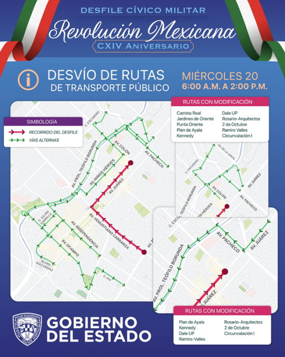 Chihuahua.- La Secretaría General de Gobierno a través de la Subsecretaría de Transporte da a conocer las modificaciones temporales en 10 rutas que circulan de las zonas sur y poniente hacia al centro, esto con motivo del tradicional desfile en conmemoración del 114 Aniversario de la Revolución Mexicana.