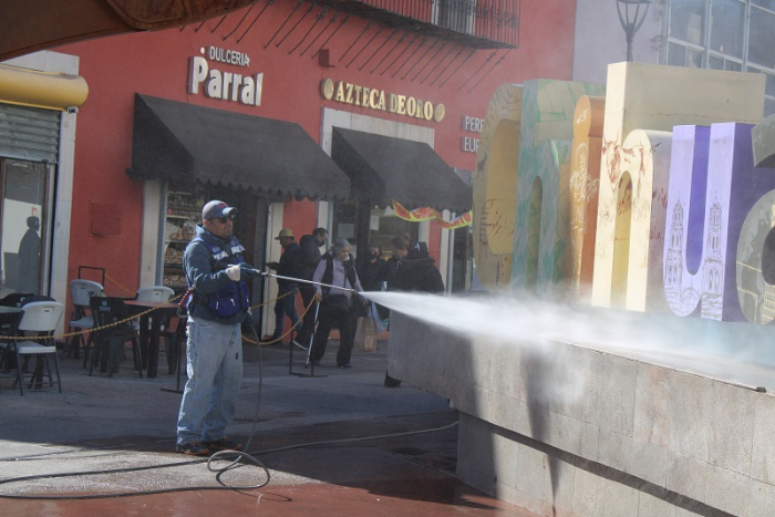 Dada la afluencia de visitantes al primer cuadro de la Capital del estado, personal de la Subdirección de Servicios Múltiples de la mencionada dependencia, efectúa labores de limpieza en tres turnos laborales.