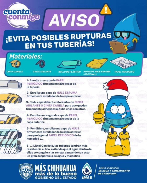 Chihuahua, Chih.- Ante las bajas temperaturas previstas durante la presente temporada invernal, la Junta Municipal de Agua y Saneamiento (JMAS) de Chihuahua exhortó a la población a proteger las tuberías externas de sus domicilios, para evitar posibles rupturas.Asegurar los conductos de agua potable, es crucial para prevenir daños por congelamiento, los cuales pueden cubrirse con materiales aislantes como periódico, plástico, papel, telas gruesas o productos especializados.