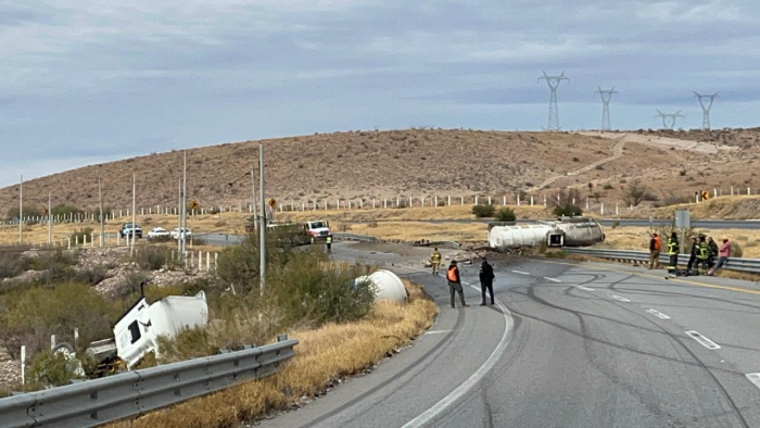 Chihuahua, Chih.- Una pipa cargada con combustible volcó esta mañana en el kilómetro 181-182 de la carretera Chihuahua-Delicias, causando el cierre total de la vía.La Guardia Nacional resguardó la zona ante el riesgo de derrame, mientras persiste confusión sobre el estado del conductor, quien podría estar lesionado.