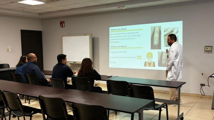 CHIHUAHUA, Chih.- Estudiantes del programa de Maestría en Salud en el Trabajo impartieron diversos cursos enfocados en los factores de riesgo presentes en el proceso laboral, capacitando a 34 empleados de empresas como Yazaky, Good Food, CESSA San Felipe, IVEX Protective Packaging, Jabil Circuit y el Laboratorio de productos cárnicos FZyE.