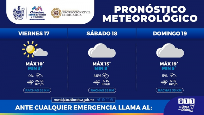 Para este viernes la temperatura máxima pronosticada será de 10°C con vientos de 25 a 35 kilómetros por hora y rachas de hasta 55 kilómetros por hora, mientras que para mañana sábado 18 de febrero la mínima será de 8°C con máxima de 15°C, viento de 5 a 15 kilómetros por hora con rachas de 35 kilómetros por hora y un 46 por ciento de probabilidad de precipitaciones, que en algunas zonas del municipio de Chihuahua podría presentarse en forma de agua nieve.