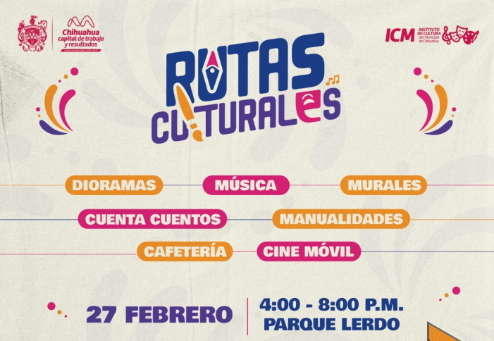 Chihuahua, Chih.- Con el objetivo de llevar la cultura a distintos puntos de la ciudad y aprovechar los espacios públicos como foros de expresión, el Gobierno Municipal y el Instituto de Cultura, invitan al programa Rutas Culturales, que inicia el 27 de febrero a las 16:00 horas en el Parque Lerdo.