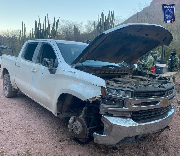 Detectando un vehículo tipo pick up abandonado de la marca Chevrolet, línea Silverado, modelo 2022, color blanco, sin placas de circulación, y al revisar sus números de serie se conoció que tenía reporte de robo desde el 29 de diciembre del 2023, en Nuevo México, Estados Unidos