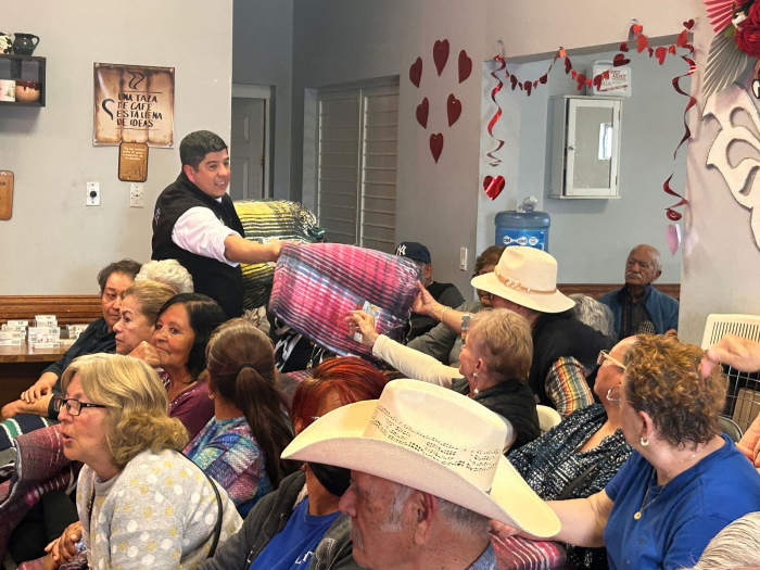 Por FELAChihuahua, Chih.- Con el compromiso de apoyar a la comunidad, el regidor Adán Galicia visitó el día de ayer el Club del Abuelo "Genaro Vázquez", ubicado en la colonia Villa Nueva, donde hizo entrega de 150 cobijas a las personas de la tercera edad que asisten a este centro.
