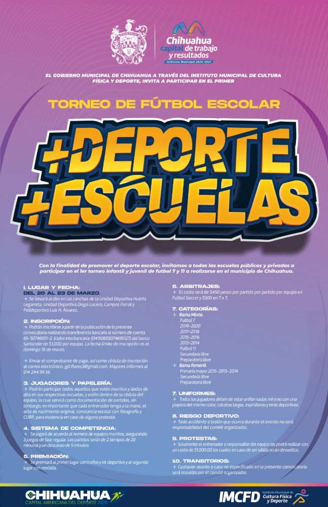 Podrán consultar las bases de la convocatoria en la página oficial del Gobierno Municipal de Chihuahua “Torneo de fútbol Escolar Más Deporte Más Escuelas” https://www.municipiochihuahua.gob.mx/CCS/Convocatorias