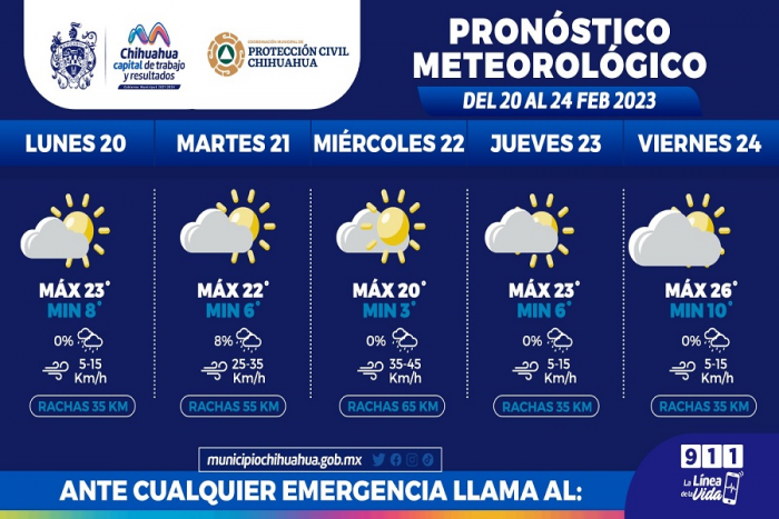 Chihuahua, Chih.- La Coordinación Municipal de Protección Civil, informa que, para la semana del 20 al 24 de febrero, se pronostican días cálidos, con mañanas y noches frías, además de fuertes rachas de viento para el martes 21 y miércoles, por lo que exhortan a seguir cuidándose para evitar afecciones a la salud por cambios bruscos de temperatura.