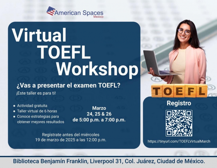 CHIHUAHUA, Chih.- El Consulado General de Estados Unidos en Ciudad Juarez invita a estudiantes universitarios a participar en un taller virtual gratuito de TOEFL los días 24, 25 y 26 de marzo de 2025 ofrecido por la Biblioteca Benjamin Franklin. Este taller de 6 horas (2 horas por día), dirigido por un facilitador estadounidense, está diseñado para personas que van a presentar el examen TOEFL y desean prepararse mejor.Detalles del Taller: