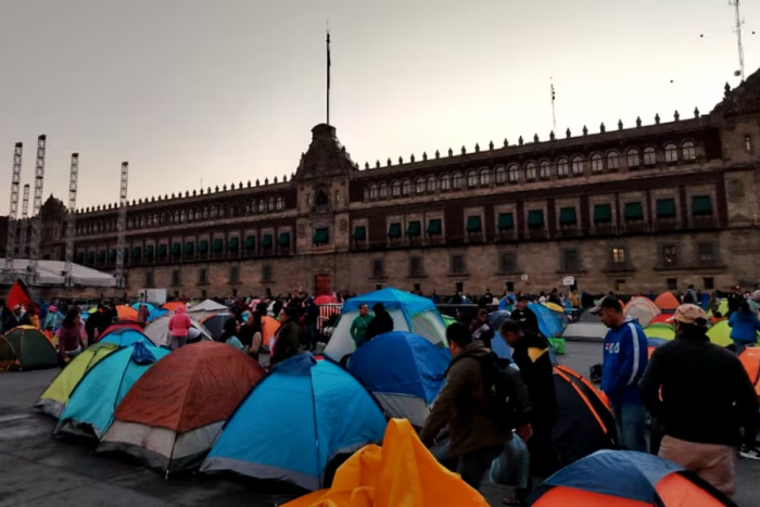 Frente a Palacio Nacional, los integrantes de la CNTE montaron la madrugada de este miércoles casas de campaña, carpas y lonas. Refirieron que está acción forma parte del paro laboral de 72 horas que anunciaron previamente.