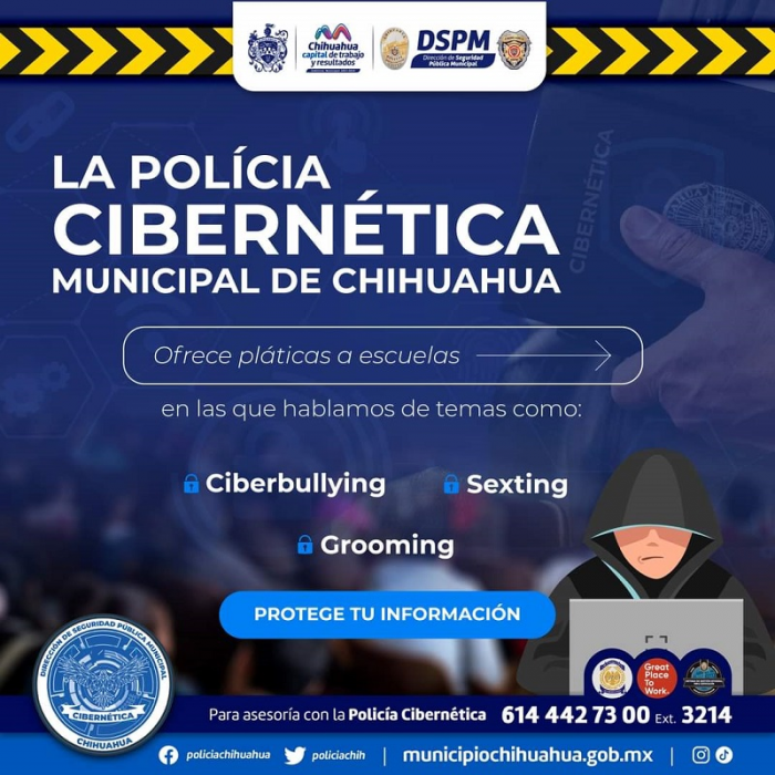 Para mayor información sobre Policía Cibernética, asesoría, pláticas preventivas o apoyo al ser víctima, se puede marcar el 072 y/o 614 442 7300, extensión 3214, acudir directamente a Homero 500 en colonia Revolución o hacer contacto en el correo policia.cibernetica@mpiochih.gob.mx