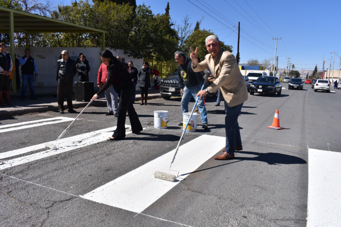 Chihuahua, Chih.- Comprometido con la educación y lograr un entorno seguro tanto para padres como para los estudiantes, el diputado del PAN, Mario Rodríguez, realizó la pintura de pasos peatonales en la Escuela Secundaria Número 32.