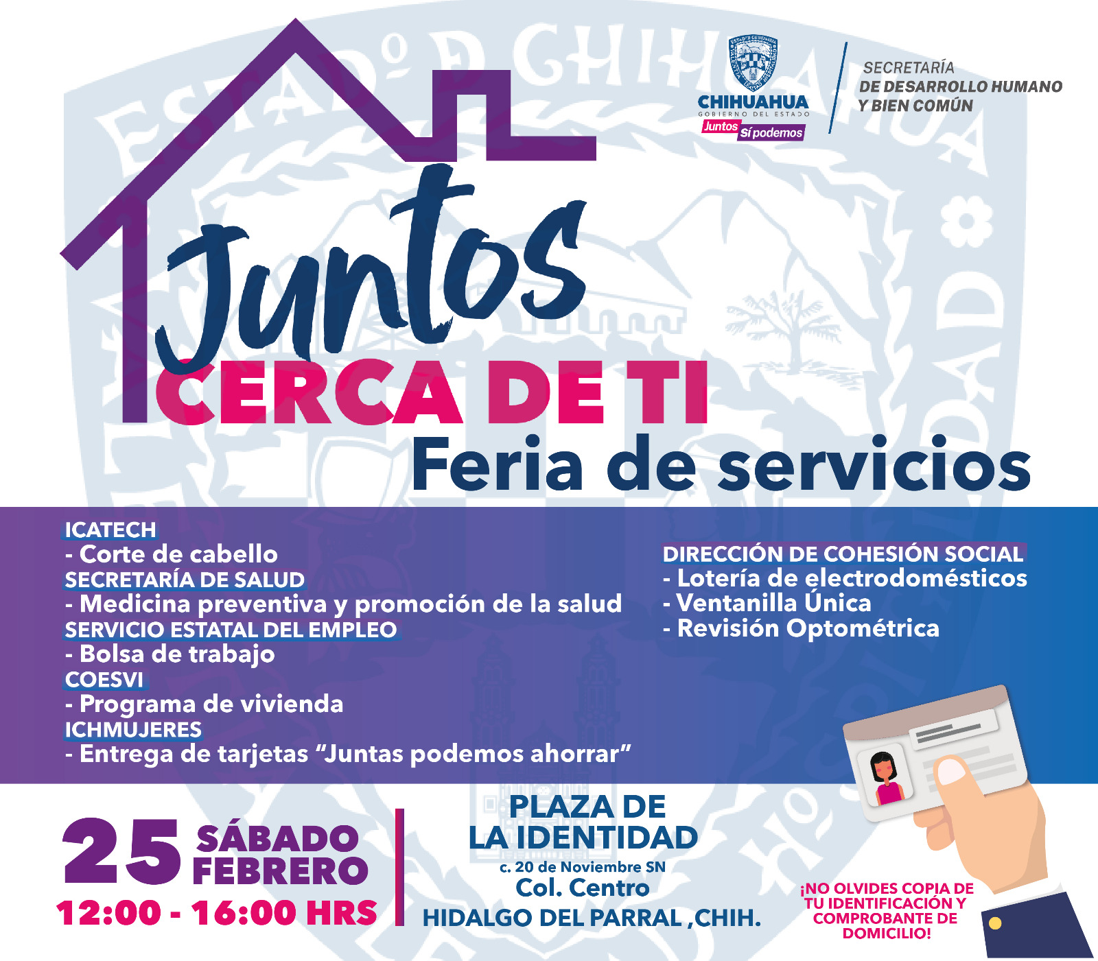 Chihuahua, Chih.- Gobierno del Estado, a través de la Secretaría de Desarrollo Humano y Bien Común (SDHyBC), invita a la ciudadanía a aprovechar este sábado 25 de febrero la feria de servicios “Juntos Cerca de Ti”, en Hidalgo del Parral.