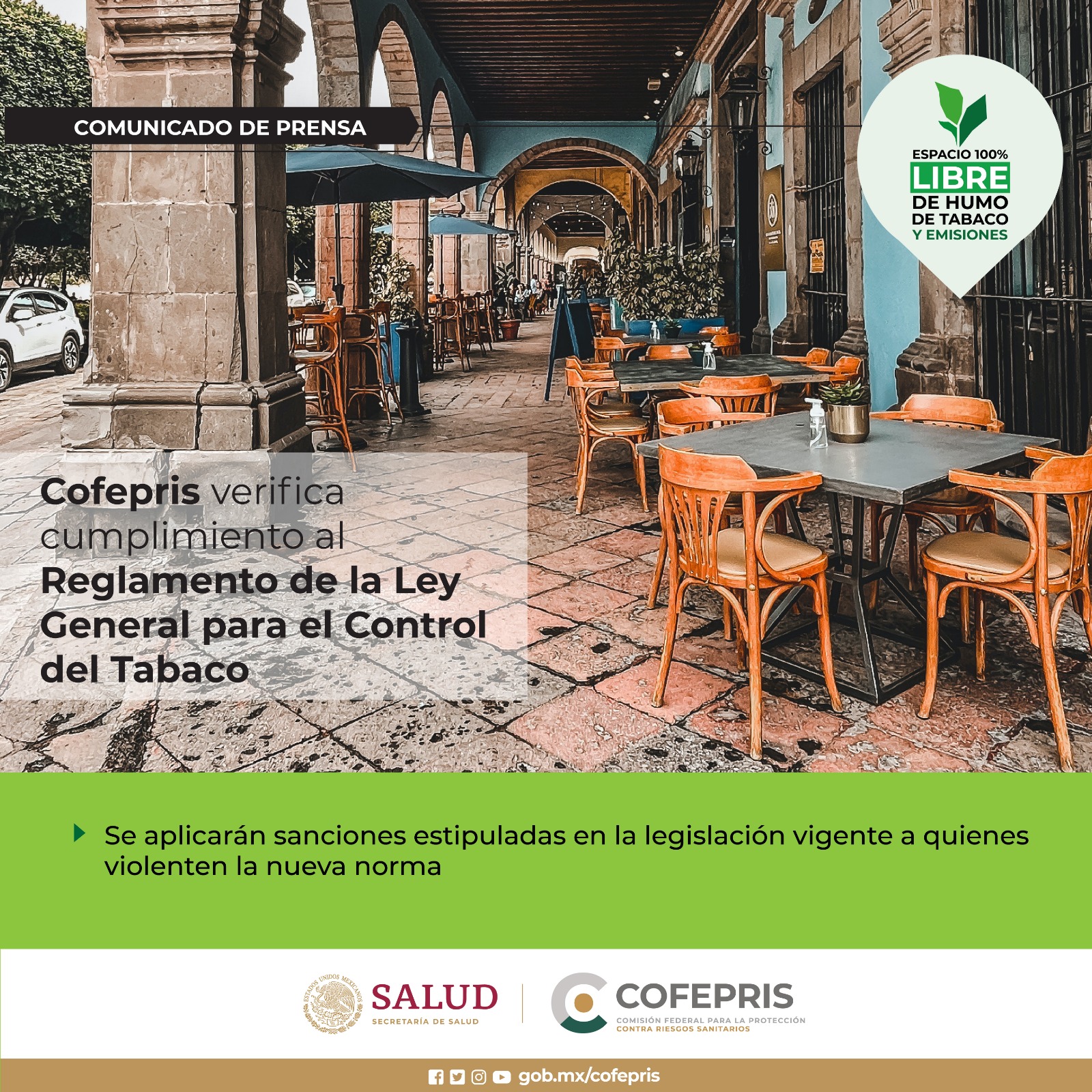 Ciudad de México. – La Comisión Federal para la Protección contra Riesgos Sanitarios (Cofepris) realiza visitas de verificación en coordinación con las autoridades estatales de salud, para vigilar que establecimientos cumplan el nuevo Reglamento de la Ley General para el Control del Tabaco (RLGCT).