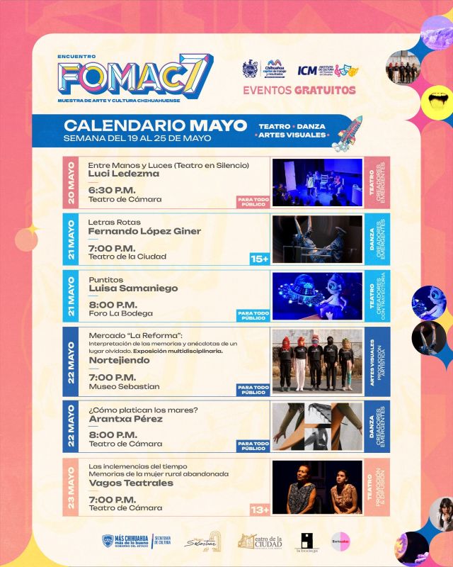 Chihuahua, Chih. - El Gobierno Municipal de Chihuahua, a través del Instituto de Cultura del Municipio, invita a la ciudadanía a disfrutar de la programación semanal del Encuentro FOMAC 7, una muestra de arte y cultura chihuahuense con entrada completamente gratuita.