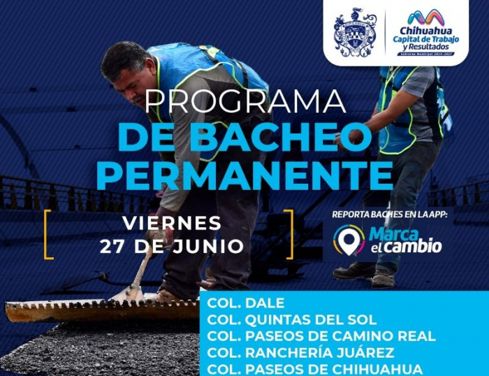 Chihuahua, Chih.- El Gobierno Municipal, por medio de la Dirección de Obras Públicas, informa que hoy 27 de junio se tendrá bacheo en calles de las colonias Dale, Quintas del Sol, Paseos de Camino Real, Ranchería Juárez y Paseos de Chihuahua.