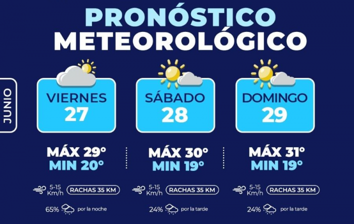 Para este sábado, se anticipa una máxima de 30°C y mínima de 19°C, con cielo parcialmente nublado; y finalmente, para este domingo se esperan máximas de 31°C, mínimas de 19°C, cielo parcialmente nublado, así como un 24 por ciento de probabilidad de lluvia para ambos días.