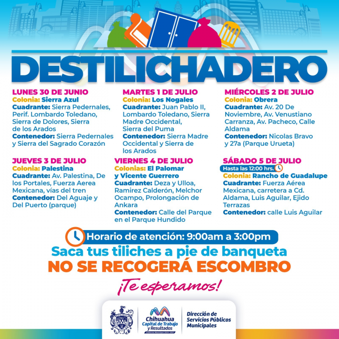 Por FELAChihuahua, Chih.– Con el objetivo de mantener las colonias limpias y apoyar a las familias que buscan deshacerse de basura de gran tamaño, el programa Destilichadero llegará a siete colonias de la capital entre el 30 de junio y el 5 de julio.